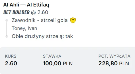 Oba zespoły przystępują do tego spotkania w bardzo dobrej dyspozycji, a ich mecze w ostatnim czasie regularnie dostarczają sporo emocji i dużej liczby goli. Zarówno Al-Ahli, jak i Al-Ettifaq grają odważnie, ofensywnie i nie zamykają się na własnej połowie, przez co ich spotkania często zamieniają się w wymianę ciosów. Szczególnie na wyjazdach Al-Ettifaq potrafi być groźny – w każdym delegacyjnym meczu w tym sezonie zespół trafił przynajmniej raz do siatki. Z drugiej strony Al-Ahli jest jedną z najbardziej rozpędzonych ekip w lidze i u siebie gra bardzo intensywnie, wysoko pressując i szybko przechodząc do ataku. Trudno więc wyobrazić sobie scenariusz, w którym któraś ze stron całkowicie zdominuje mecz do zera z tyłu. Dlatego naturalnym wyborem wydaje się zakład BTTS. Dodatkowo warto spojrzeć w kierunku Ivana Toneya. Anglik jest w kapitalnej formie – w ostatnich 7 meczach strzelił 10 goli, a od początku sezonu ma już 22 trafienia we wszystkich rozgrywkach. Jest regularny, pewny w polu karnym i praktycznie zawsze dochodzi do sytuacji strzeleckich. Typuję BTTS + gol Ivana Toneya. Zachęcam do regularnego obserwowania zakładki typy dnia lub do sprawdzenia innych propozycji na Zagranie!