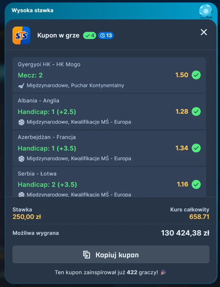 Strefa Inspiracji STS daje opcję na przeszukiwanie kuponów postawionych przez graczy w różnych konfiguracjach. Pozwala to na znalezienie rozwiązania, która aktualnie jest nam najbardziej bliskie. I tak w podstawowym zakresie gracz może wyświetlić kupony: