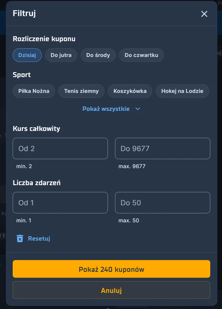 • liczby zdarzeń na kuponie (można wybrać przedział)