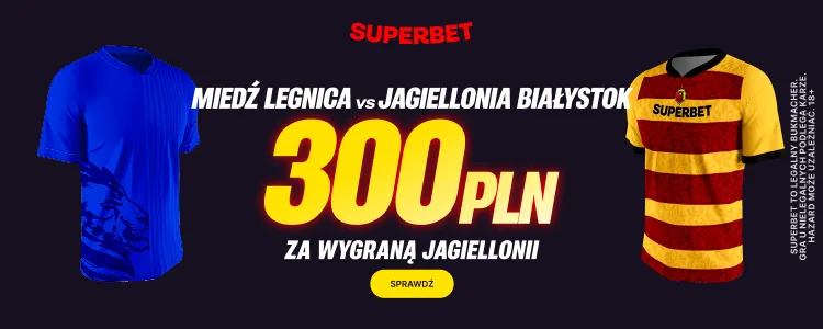 - 5 Bonus 300 zł od Superbet za typ na wygraną Jagiellonii Białystok z Miedzią Legnica w Pucharze Polski
