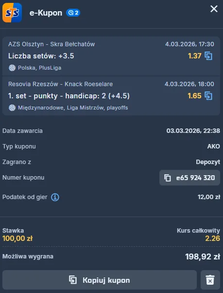 Z tym, że teamowi gości nie można ot tak odbierać szans. W końcu oni również z dobrej strony pokazali się w fazie grupowej tegorocznej edycji CEV Ligi Mistrzów. Knack Volley Roeselare stał się w tym sezonie drużyną, która dawała się we znaki mistrzowi Polski; czyli zespołowi, który nie raz ogrywał też rzeszowian. W dodatku przyjezdni znów nie będą mieli nic do stracenia, a właśnie w takich spotkaniach są najniebezpieczniejsi; czego dowodzili wielokrotnie w tym sezonie w tych rozgrywkach. Stąd też obstawiam z kodem promocyjnym STS, że w 1. secie Knack zdobędą przeszło 20 punktów.