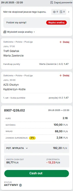 Podsumowując, moim 2. typem siatkarskim, który jest stawiany z kodem promocyjnym Superbetu jest wskazanie, że w premierowej odsłonie zespoły zdobędą więcej niż 44 punkty. Podejmuję się tego wyboru, ponieważ jest to konfrontacja tego typu, w którym za gospodarzami przemawia równiejsza i stabilniejsza forma, a za przyjezdnymi dłuższy odpoczynek i fakt, że ostatnimi czasy wolniej wchodzą w potyczki. Jednak też nie na tyle, by z teamem pokroju AZS-u zdobywać mniej niż 20 punktów.