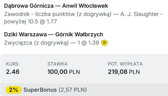 Górnik Wałbrzych często daje się we znaki zespołom, które preferują szybki basket, takim jak Dziki Warszawa. W takich spotkaniach starają się spowalniać grę, czasem posługując się faulami, co jednak nie zawsze przynosi oczekiwany efekt – tak było choćby w przegranym meczu z Anwilem Włocławek. Dziki prezentują w ostanich tygodniach bardzo dobrą koszykówkę, a dzisiejsze spotkanie odbędzie się na ich terenie, w hali Koło. Biorąc pod uwagę formę i styl gospodarzy, typuję zwycięstwo Dzików Warszawa. Zachęcam do regularnego obserwowania zakładki typy dnia lub do sprawdzenia innych propozycji na Zagranie!