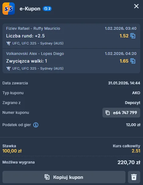 Organizacja UFC z przytupem wita 2026 r. Raptem tydzień temu miała miejsce ich pierwsza numerowana gala, a już dziś dojdzie do następnej. Tym razem również stawką main eventu będzie mistrzowski pas. Z tą różnicą, że już nie tymczasowy i nie kategorii lekkiej. Do obrony tytułu przystąpi Alexander Volkanovski, który zmierzy się z rankingowym numerem 2, czyli Diego Lopesem. Ich konfrontację poprzedzi rywalizacja między innymi Rafaela Fizieva z Mauricio Ruffy’m.