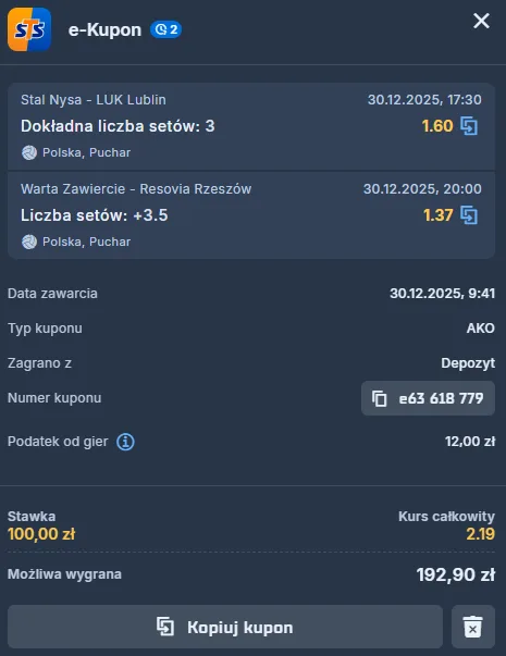 Podsumowując, obstawiam, że zespół LUK-u weźmie przykład z wczorajszej postawy olsztyńskiego AZS-u. Tym samym obstawiam jako 1. siatkarski typ (stawiany z kodem promocyjnym STS-u) to, że w tym spotkaniu również kibice poznają zwycięzcę po rozegraniu raptem 3 setów.