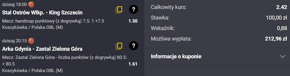 Arka znajduje się obecnie w lekkim dołku formy, podczas gdy Zastal wyraźnie pnie się w górę i z meczu na mecz wygląda coraz pewniej. Trudno jednak jednoznacznie stwierdzić, czy zielonogórzanie będą w stanie „dobić” Arkę, bo grają na wyjeździe, co z góry daje gospodarzom pewien atut i może pomóc im ustabilizować grę po ostatnich potknięciach. Niezależnie od końcowego wyniku spodziewam się jednak ofensywnego występu gości. Zastal rzuca średnio około 90 punktów na mecz, a jego liderzy ofensywni są w bardzo dobrej dyspozycji strzeleckiej. Zespół ma argumenty, by regularnie punktować i utrzymać wysokie tempo gry. Typuję, że Zastal zdobędzie powyżej 80.5 punktu. Zachęcam do regularnego obserwowania zakładki typy dnia lub do sprawdzenia innych propozycji na Zagranie!