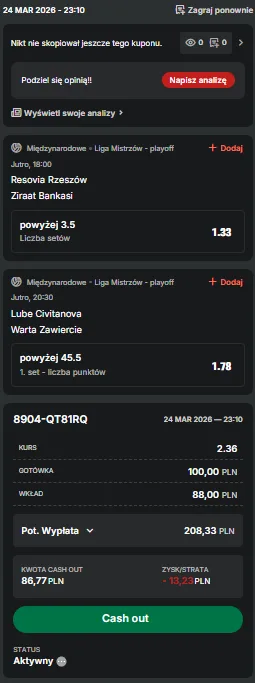 - Należy obstawić typ na to, że Resovia Rzeszów wygra seta w meczu z Ziraatem Bankasi w 1/4 finału CEV Ligi Mistrzów,