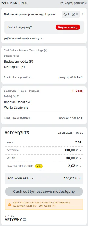 Tym samym będzie to starcie z gatunku tych, w którym detale będą decydować o zwycięstwie jednej ze stron. Sama wygrana łodzianek jest rzeczywiście bardziej prawdopodobna, ale prawdopodobnie nie do zera. Zwłaszcza, że są zmuszone radzić sobie bez kontuzjowanej 1. rozgrywającej. Stąd też obstawiam z kodem promocyjnym Superbetu, że już w 1. partii drużyny zdobędą przeszło 43 oczka. Są faworytkami, ale opolanki najpewniej dadzą się we znaki. Zespół UNI raz po raz pokazuje, że lubi z przytupem rozpoczynać rywalizacje.