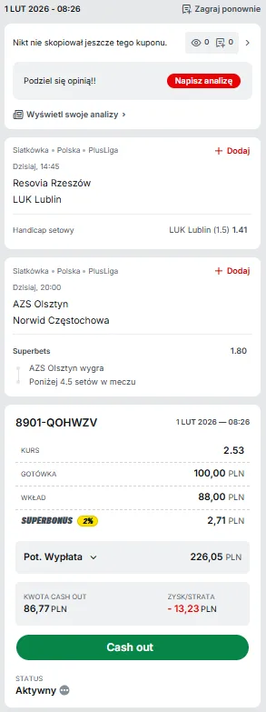 Mówiąc o tym spotkaniu, przypomnijmy, że to olsztynianie w tym sezonie są zespołem, który szybciej wyciąga wnioski. A też okazji do odbudowania się poszukają przed własną publicznością. Choć ulegli tu już raz najbliższym oponentom (wynikiem 1:3), to team gości w sezonie 24/25 prezentował się znacznie lepiej niż obecnie. Teraz są w takiej formie, że jeśli tylko Indykpol AZS zagra na naturalnym dla siebie poziomie, to powinni zdobyć maksymalnie seta. Stąd też z kodem promocyjnym Superbet obstawiam wygraną olsztynian i to przed tie-breakiem.
