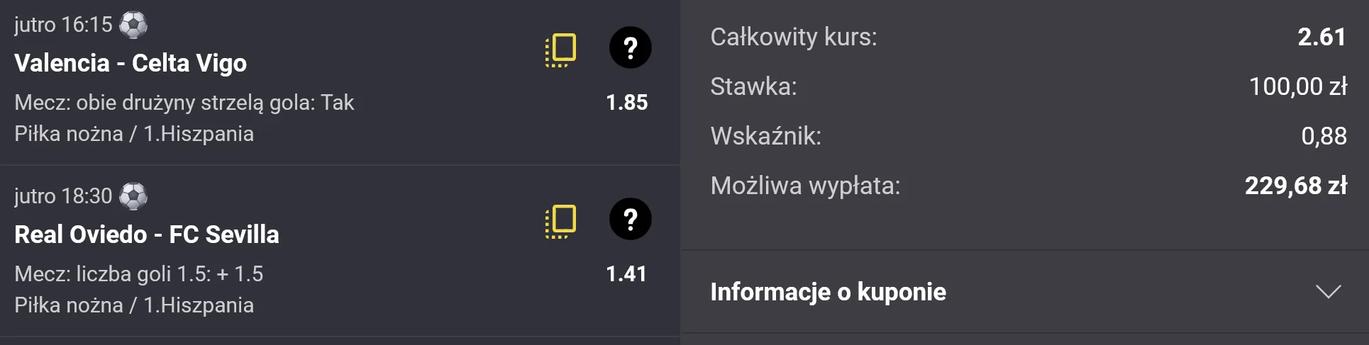Stawiam na Obie drużyny strzelą. Valencia regularnie znajduje drogę do bramki na Mestalla, a Celta, mimo wpadek, dysponuje jakością w ofensywie, która powinna wystarczyć na co najmniej jedno trafienie. Nawet w blamażu przeciwko Alaves potrafili budować świetne akcje, które ostatecznie nie dały im nawet punktu przez błędy w obronie. BTTS’a postawisz w Fortunie. Jeśli nie masz tam jeszcze konta, możesz założyć je z naszym kodem promocyjnym Fortuna.