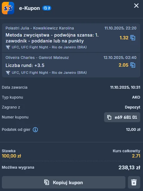 Bukmacherzy są zdania, że Julia Polastri rozprawi się z Karoliną Kowalkiewicz-Zaborowską. Są tego tak pewni, że np. w STS-ie kurs na wygraną Brazylijki wynosi raptem 1.16. Z kolei ewentualny triumf reprezentantki Polski – u tego samego operatora – stał się zdarzeniem, któremu przyznano mnożnik 5.25.