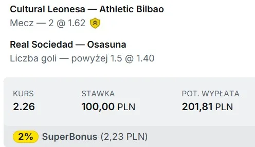 Bez wątpienia Real Sociedad jest obecnie napędzany zmianą trenera i solidnymi wynikami, co wyraźnie poprawiło atmosferę wokół zespołu. Jednak jak na spotkanie pucharowe, nie można lekceważyć Osasuny, bo tego typu mecze rządzą się własnymi prawami, a różnice ligowe często schodzą na dalszy plan. Dodatkowo nowy szkoleniowiec, Pellegrino Matarazzo, znany jest z otwartego, ofensywnego stylu gry, w którym jego drużyny chętnie atakują i nie boją się podejmować ryzyka. Taki model futbolu sprzyja sytuacjom bramkowym, ale jednocześnie pozostawia przestrzeń w defensywie, co może działać na korzyść obu stron. Wszystko to sprawia, że można spodziewać się otwartego meczu z sytuacjami po obu stronach. Nawet jeśli Sociedad będzie stroną dominującą, Osasuna powinna mieć swoje momenty. Typuję powyżej 1,5 gola w meczu. Zachęcam do regularnego obserwowania zakładki typy dnia lub do sprawdzenia innych propozycji na Zagranie!