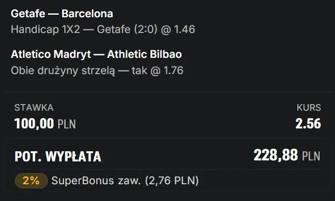 Athletic Bilbao ma zdecydowanie więcej do ugrania w tym meczu – wciąż realnie walczy o miejsce w topowej szóstce i awans do europejskich pucharów. Każdy punkt jest na wagę złota, więc motywacji na pewno im nie zabraknie. Z kolei Atlético Madryt również powinno podejść do spotkania poważnie, chcąc złapać rytm przed najważniejszym dwumeczem sezonu. Problemem pozostaje jednak defensywa – w ostatnich 8 meczach stracili aż 17 bramek, co jasno pokazuje skalę problemu. Wszystko wskazuje na otwarte spotkanie, w którym obie drużyny będą miały swoje sytuacje. Typuję BTTS (obie drużyny strzelą gola). Zachęcam do regularnego obserwowania zakładki typy dnia lub do sprawdzenia innych propozycji na Zagranie!