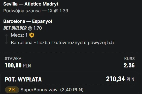 Myślę, że Atlético Madryt może podejść do tego meczu z mniejszą intensywnością, mając z tyłu głowy nadchodzące spotkanie w Lidze Mistrzów. Po ostatnich wydarzeniach kolejna wpadka w Europie byłaby bardzo kosztowna, dlatego priorytety mogą być jasne – pełne skupienie na wtorkowym meczu. W La Lidze ich sytuacja jest stabilna – miejsce w czołówce i awans do Ligi Mistrzów są praktycznie zapewnione, więc nie mają aż takiej presji na wynik. Przy tak dużych problemach kadrowych naturalne może być oszczędzanie części zawodników. Z kolei Sevilla potrzebuje punktów jak tlenu i nie może sobie pozwolić na odpuszczenie. Przy problemach zdrowotnych rywala to dla nich duża szansa. Dlatego typuję wygraną lub remis Sevilli. Zachęcam do regularnego obserwowania zakładki typy dnia lub do sprawdzenia innych propozycji na Zagranie!