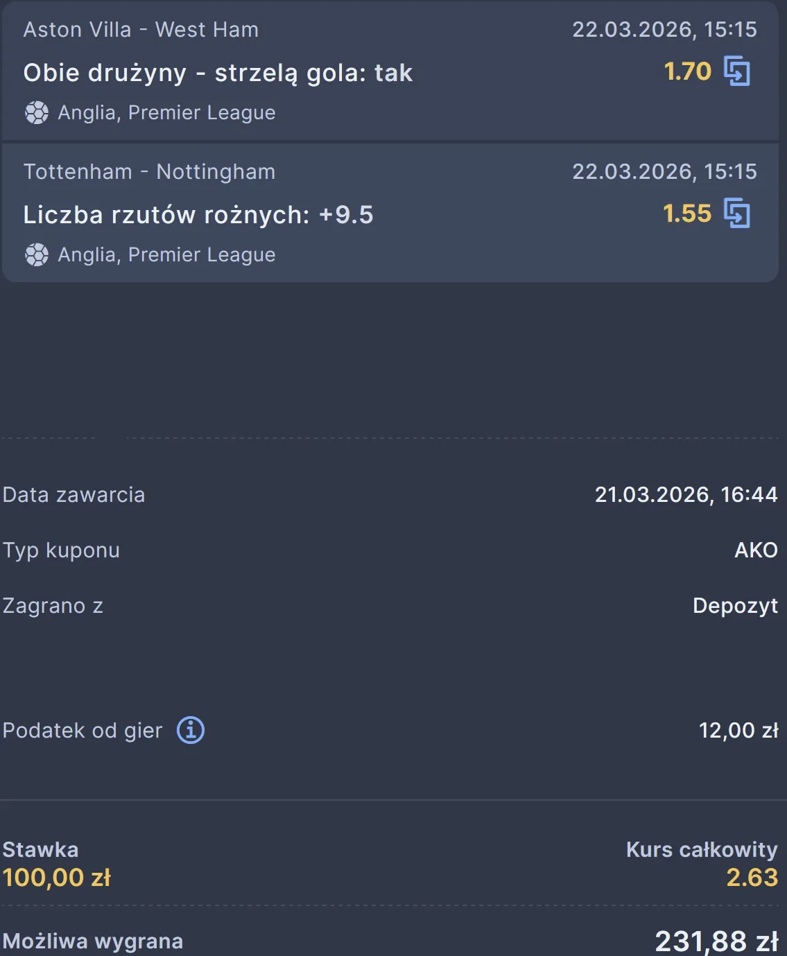 Postawię na Obie drużyny strzelą. Aston Villa jest w wyraźnym dołku formy i ma spore problemy w defensywie, przez co regularnie traci bramki. Jednocześnie nadal posiada jakość w ataku, szczególnie u siebie, więc trudno sobie wyobrazić, żeby nie stworzyli sytuacji bramkowych. West Ham z kolei gra bardzo ambitnie, walczy o utrzymanie i w ostatnich tygodniach potrafił strzelać nawet mocniejszym rywalom. Przy takiej mieszance (słabsza obrona gospodarzy i waleczność gości) scenariusz z golami po obu stronach wydaje się bardzo prawdopodobny. BTTS możesz postawić w STS. Jeśli nie masz jeszcze konta u tego bukmachera, możesz założyć je z naszym kodem promocyjnym STS.