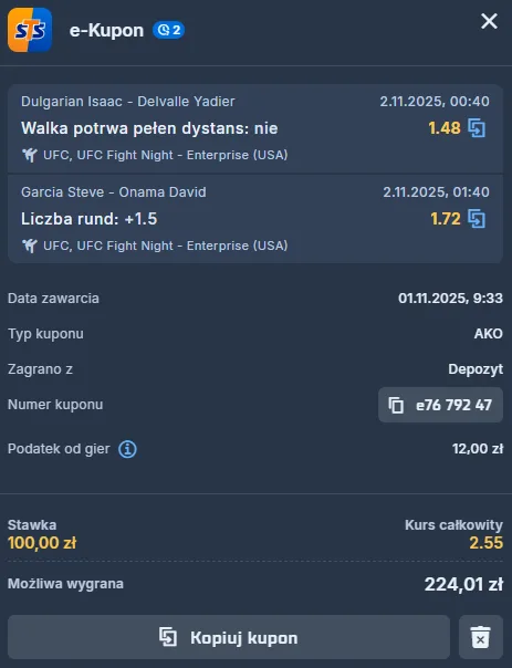 Tym samym powinni być też ostrożniejsi niż we wcześniejszych potyczkach. Właśnie z tym jest związany 2. typ MMA stawiany z kodem promocyjnym STS-u na dziś. Obstawiam, że ich konfrontacja potrwa dłużej niż półtorej rundy. Onama już nie idzie tak często w wymiany jak wcześniej, co dobitnie pokazują ostatnie 3 rozstrzygnięcia jego walk. Rzeczywiście kończyły się jego wygranymi, ale za każdym razem jednogłośnymi werdyktami sędziowskimi. Ostrożniejszym niż zwykle najpewniej będzie też Steve Garcia. Ostatni występ, tj. z Calvinem Kattarem również zwyciężał za sprawą werdyktu arbitrów punktowych.
