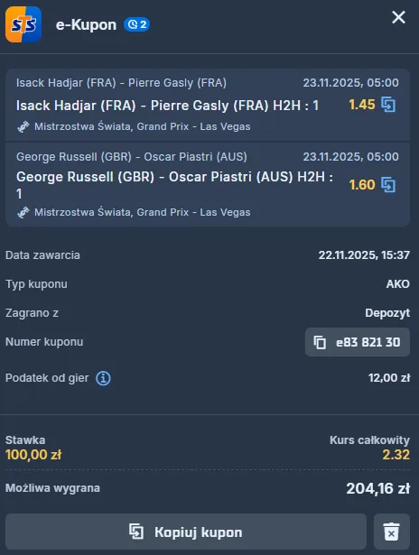 George Russell w GP Las Vegas dojedzie do mety przed Oscarem Piastrim? Gramy o 204 PLN
