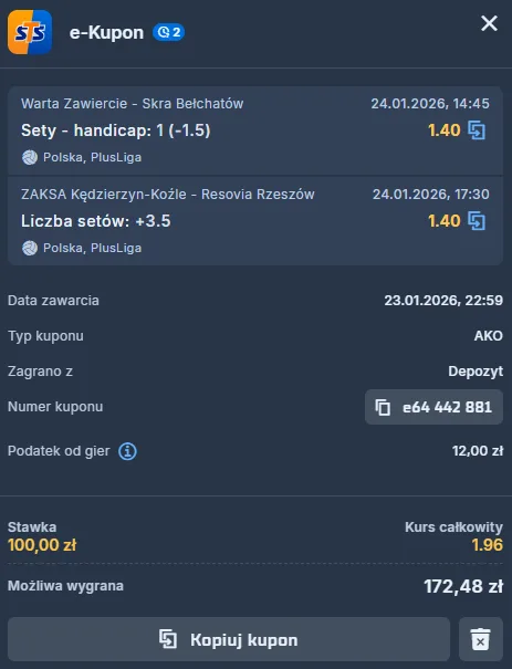 Ponadto, warto zauważyć, że po stronie Asseco Resovii występuje on wtedy, kiedy kilka poprzednich rywalizacji wychodzi im nad wyraz dobrze. Im więcej rozegrają takich meczów, tym trudniej utrzymać i potem wskrzesić koncentrację do optymalnego poziomu. Dlatego też będzie to pojedynek między drużynami, które dopiero szukają swojej optymalnej formy. Mając na uwadze jakość i formę graczy, wchodzących w skład obu drużyn – dlatego obstawiam z kodem promocyjnym STS, że 6. raz z rzędu ich spotkanie nie zakończy się po rozegraniu tylko 3 setów.
