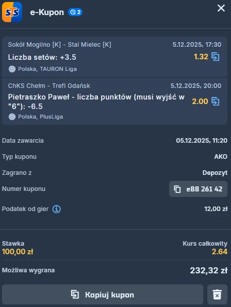 Stąd też 2. siatkarskim typem jest wskazanie, że Paweł Pietraszko nie zdobędzie więcej niż 6 punktów w tym spotkaniu. Jeszcze, gdyby to była wyrównana batalia, tj. trwająca przynajmniej 5 setów, wówczas można, by się zastanawiać, czy drużyna Energa Trefla nie zacznie stosować innych rozwiązań niż np. gier skrzydłami. Natomiast tutaj nie zanosi się na aż tak długą rywalizację. Ponadto, Pietraszko w ostatniej kolejce zdobył tylko punkt, a we wcześniejszej 6.