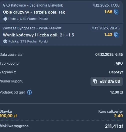 Przygotowaliśmy kod promocyjny STS, dzięki któremu możesz zgarnąć atrakcyjne bonusy na start! GKS Katowice krok po kroku zaczyna wyglądać jak zespół coraz pewniej czujący się w Ekstraklasie. Po 16 kolejkach mają na koncie 20 punktów, co jak na początek sezonu jest wynikiem solidnym. W ostatniej serii gier odnieśli cenne zwycięstwo 2:0 nad Pogonią Szczecin, kontrolując mecz i pokazując, że potrafią wygrywać nie tylko ambicją, ale też organizacją gry. Dobrą formę prezentują również w Pucharze Polski. Najpierw wyeliminowali świetnie dysponowaną Wisłę Płock, a potem pewnie przeszli ŁKS. Katowiczanie wyglądają dziś jak drużyna, która coraz lepiej rozumie realia Ekstraklasy i ma wszelkie argumenty, by w tym sezonie grać znacznie spokojniej, niż wielu przewidywało.