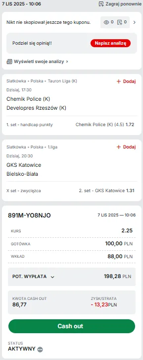 Podsumowując, obstawiam z kodem promocyjnym Superbetu, że w premierowej odsłonie górą – przy doliczeniu odpowiednio wysokiego handicapu – będzie zespół gospodarza. Jeszcze w tej premierowej odsłonie będą w stanie wykorzystywać to, że rywalki pokonały długą podróż oraz, że nie miały czasu na spokojną regenerację i trening. To oznacza, że „Rysice” zaczną grę najpewniej na sztywniejszych nogach, a być może nawet tak rozegrają całe starcie. Tym razem wygrana seta przez Chemik jest więcej niż możliwa.