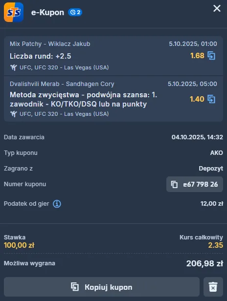 Bukmacherzy uważają, że zwycięsko z tej potyczki wyjdzie Patrick „Patchy” Mix. Kurs na jego wygraną na UFC 320 wynosi raptem 1.30. Z kolei ewentualna wiktoria Jakuba Wikłacz równa jest mnożnikowi 3.60. Różnica jest spora, ale myśląc o niej należy pamiętać o czymś jeszcze, co nie zostało wspomniane wyżej. Do ich konfrontacji dojdzie w Las Vegas, czyli warunkach pasujących bardziej „Patchy”. Rzeczywiście „Masa” też spędził już kilka miesięcy zza oceanem, ale jednak siłą rzeczy nie jest w stanie aż tak się zaaklimatyzować, co jego najbliższy przeciwnik.