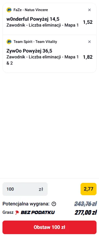 Typ: Zywoo powyżej 36.5 zabójstw (1. i 2. mapa). Zywoo podczas tego turnieju gra świetnie i myślę, że podtrzyma tą dyspozycję w tym starciu. Przede wszystkim ma kolegów na których może bardziej polegać i na Spirit gra mu się nieźle. W tym roku zdobył na nich rating 1.41, a na Majorze w Budapeszcie ma obecnie 1.56. W meczu z Mongolz pokazał absolutną dominację, a Spirit na pewno postawi się zdecydowanie bardziej, więc Francus powinien swoje szanse w tym starciu dostać.