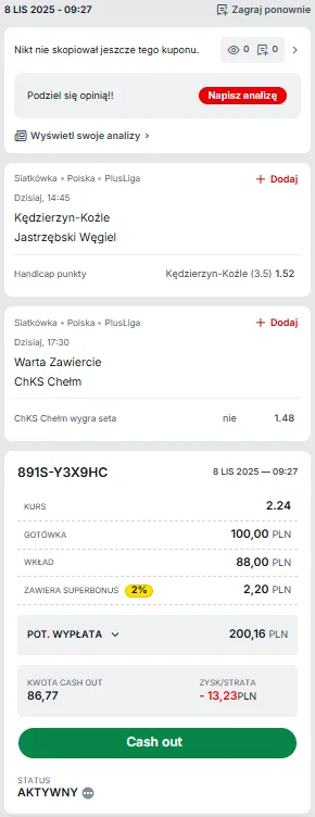 Dlatego też koniec końców wraz z kodem promocyjnym Superbetu obstawiam jako 2. typ dnia to, że ostatecznie drużyna InPost ChKS-u Chełmu nie zdobędzie seta. Podejmuję się tego wskazania, ponieważ choć potrafią powalczyć, tak nie mają aż takiej jakości i takiego ogrania, by nagle walczyć na wyjeździe z zespołem pokroju Aluron CMC Warty. Ligowy beniaminek jest w stanie walczyć z równymi sobie, czyli np. z Cuprumem, ale nieprzypadkowo do zera ulegali BOGDANKA LUK-owi i PGE Projektowi.