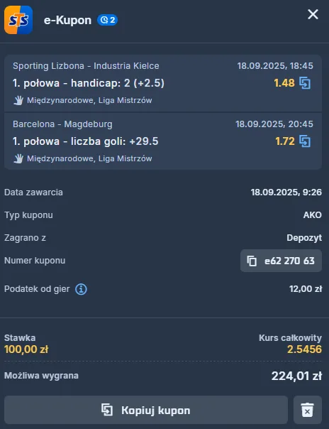 Bukmacherzy uważają, że minimalnym faworytem są przyjezdni. Ich przekonanie wynika przede wszystkim z racji tego, do jakich rozstrzygnięć dochodziło, choćby w poprzednich 5 meczach między tymi drużynami – a zwłaszcza w ostatniej potyczce. Dlatego też w zasadzie nie dziwi, że kurs na wygraną Magdeburczyków w STS-ie wynosi 2.02, a na triumf szczypiornistów Barcy – u tego samego operatora – już 2.25. Z kolei wycena remisu w tym meczu wynosi u nich 7.40.