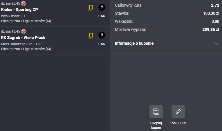 Ci, którzy bronią barw obecnych wicemistrzów Polski już nie raz zmagali się z nawet trudniejszymi sytuacjami niż tą, która wystąpiła teraz. Też są na tym etapie sezonu, że z każdym kolejnym starciem są coraz bardziej pewnymi swych możliwości. W dodatku zagrają przed własną publicznością, czyli w miejscu, gdzie częściej (niż rzadziej) udanie kończyli zmagania. Ponadto, Sporting stał się teamem, który raz potrafi ograć Aalborg (wicelidera grupy A), aby wcześniej nie być w stanie pokonać HBC Nantes (5. drużyny z tabeli) i ONE Veszprem (32:31). Stąd też z kodem promocyjnym Fortuny obstawiam wygraną stabilniej grającego zespołu.