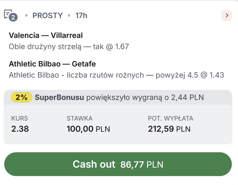 Typuję tutaj powyżej 4.5 rzutów rożnych Athleticu Bilbao. Baskowie potrafią przeprowadzać całkiem niezłe akcje ofensywne, natomiast często kuleje u nich wykończenie. Nic dziwnego, bo choć ich skrzydła są naprawdę klasowe, to jednak brakuje im „dziewiątki” z prawdziwego zdarzenia. Ich ostatnie liczby, jeśli chodzi o rogale na własnym stadionie to: 8, 7, 8, 2, 6. Linii nie pokryli wyłącznie przeciwko Arsenalowi, co raczej nie powinno dziwić biorąc pod uwagę, że w tym meczu byli raczej skazywani na pożarcie. Biorąc pod uwagę, że Getafe będzie chciało prawdopodobnie postawić autobus, spodziewam się spokojnego zazielenienia zakładu. Rogi poszczególnych drużyn możesz stawiać w Superbet. Jeśli nie masz tam jeszcze konta, możesz założyć je z naszym kodem promocyjnym Superbet.