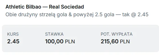 Ja jednak nie idę w stronę zwycięzcy, tylko w gole. Oba zespoły od 11 spotkań nie zachowały czystego konta. W ośmiu ostatnich meczach Athleticu padał BTTS, a w 8 z 9 również over 2.5 gola. Z kolei w każdym z ostatnich 10 spotkań Sociedad obie drużyny trafiały do siatki, a w 6 z 7 meczów oglądaliśmy minimum trzy bramki. Statystyki są jednoznaczne – defensywy nie dają stabilności, a ofensywy mają jakość. Typuję ofensywne widowisko: BTTS + powyżej 2.5 gola. Zachęcam do regularnego obserwowania zakładki typy dnia lub do sprawdzenia innych propozycji na Zagranie!