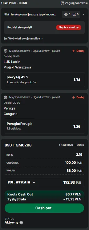 - Na kuponie musi znajdować się zakład z oferty przedmeczowej na zwycięzcę meczu LUK Lublin – Projekt Warszawa,