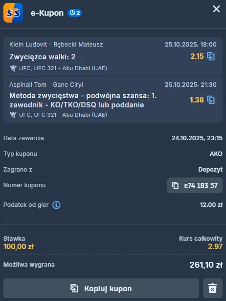 Bukmacherzy są przekonani, że na gali UFC 321 w Abu Dhabi lepiej poradzi sobie Ludovit Klein. Są o tym przekonani do tego stopnia, że kurs na triumf tego fightera w STS-ie wynosi 1.72. Z kolei ewentualna wiktoria Mateusza – u tego samego operatora – stała się zdarzeniem, któremu przyznano mnożnik 2.15.