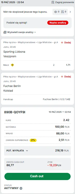 Podsumowując, spodziewam się czwartego łącznie, a drugiego z rzędu zwycięstwa ONE Veszprem nad Sportingiem Lizbona. Dlatego też to właśnie ten typ będzie dziś drugim obstawianym z kodem promocyjnym Superbetu. Kurs na to zdarzenie u tego operatora wynosi 1.71. Z kolei ewentualnej wiktorii gospodarzy przyznano wycenę 2.80. Różnica na dobrą sprawę mogłaby być jeszcze wyższa. Oto dojdzie do konfrontacji, w której jedynym atutem Sportingu jest granie u siebie. Z tym, że teamowi ONE Veszprem nie robi różnicy to, gdzie mają wygrać.