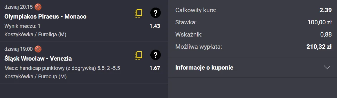 W Eurolidze zapowiada się hitowy pojedynek – Olympiakos Pireus podejmie AS Monaco, a gospodarze będą faworytem, zwłaszcza że są w znakomitej formie i u siebie niemal nie przegrywają. W Europe Cup natomiast Śląsk Wrocław zmierzy się z Reyerem Venezia. Młody zespół z Wrocławia będzie chciał sprawić niespodziankę, ale Włosi mają większe doświadczenie i motywację, by odbudować swój bilans po trudnym początku rozgrywek.