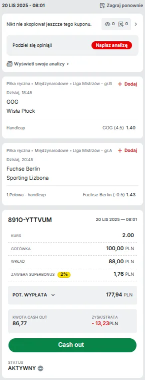 Przyjezdnym będzie dziś tym trudniej o zwycięstwo, że szczypiorniści Fuechse Berlin przystąpią do zmagań tuż po tym, jak kilka dni temu triumfowali u siebie w derbowej potyczce z THW Kiel (32:29)! Podsumowując, dlatego też to w gospodarzach upatruje się faworytów do zdobycia 2 oczek. Natomiast od siebie wraz z kodem promocyjnym Superbetu obstawiam, że do przerwy Fuechse będzie prowadzić przynajmniej jednym trafieniem.