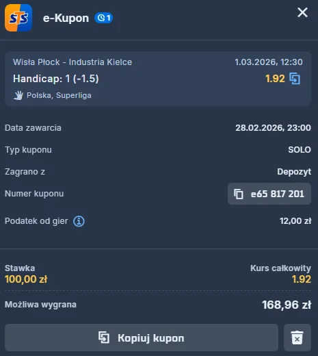 Bukmacherzy są przekonani, że po wygraną sięgną szczypiorniści ORLEN Wisły Płock. Przykładowo analitycy STS są przekonani o słuszności tej tezy do tego stopnia, że temu zdarzeniu przyznali kurs 1.68. Natomiast ci, dla których typem dnia na to spotkanie jest triumf przyjezdnych, dostrzegą, że u wspomnianego operatora ewentualnej wiktorii KS Industrii przypisano mnożnik 2.80. Wpływ na tę różnicę ma przede wszystkim to, jak istotnych zawodników zabraknie w składzie wicemistrzów Polski.
