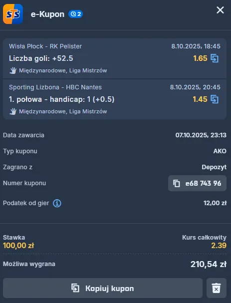 Gracze HBC Nantes również w swojej hali częściej sprawiali niespodzianki w EHF Champions League. Podsumowując, spodziewam się wyrównanej konfrontacji. Takiej, którą rzeczywiście powinni wygrać szczypiorniści HBC Nantes, ale ani wynik, ani triumf przyjezdnych nie będzie przesadnie wielkim zaskoczeniem. Sporym, lecz nie aż tak dużym, jakim byłoby np. zwycięstwo Eurofarmu nad „Nafciarzami” w Płocku. Natomiast od siebie obstawiam wraz z kodem promocyjnym STS-u to, że przy doliczeniu drobnego handicapu bramkowego, zespół Sportingu uzbiera więcej trafień po upłynięciu pierwszych 30 minut.