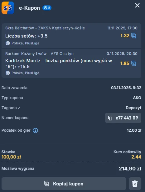 Jest to zawodnik, który w 1. kolejce zdobył 19 punktów, a w następnej serii już 25. Za ostatni występ otrzymał nawet miejsce w drużynie kolejki PlusLigi. Dostrzegając to, czytelne staje się, w jak wysokiej jest formie. Radzi sobie obecnie tak dobrze, że jest w stanie przekroczyć wspomnianą linię nawet na dystansie 3 odsłon, przy czym na tak „krótkie” granie w Elblągu się nie zanosi. Dlatego też wraz z kodem promocyjnym STS-u obstawiam to, że Karlitzek ponownie przekroczy barierę 15 zdobytych punktów.
