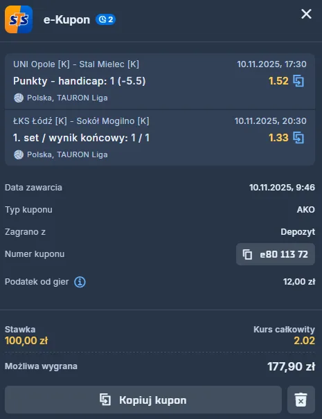 Podsumowując, analizy ostatnich ich gier i okoliczności, w jakich przystępują do tej konfrontacji, dowodzą, że słusznie postrzega się opolanki jako faworytki do wygranej. Są i w wyższej formie, i mierzą się z mniejszymi problemami zdrowotnymi. W dodatku w poprzednich starciach uniknęły kontuzji, które za to dotknęły drużynę ITA TOOLS Stali. Dlatego też obstawiam wraz z kodem promocyjnym STS-u to, że gospodynie u siebie i wygrają, i zdobędą określony handicap.