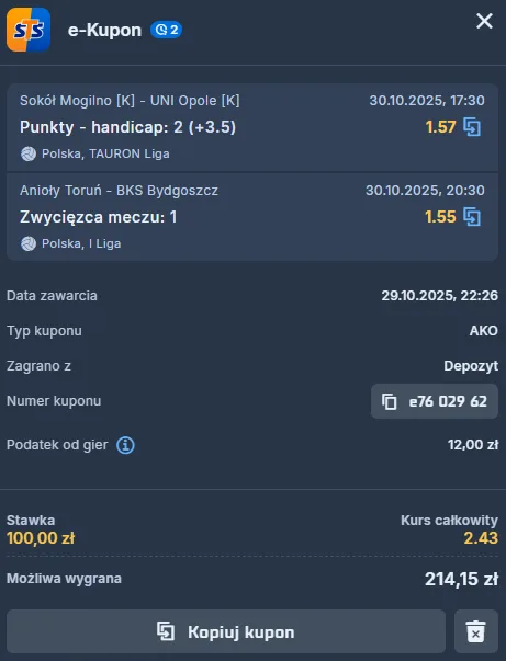 Sokół&Hagric Mogilno – UNI Opole: typy, kursy bukmacherskie i zapowiedź meczu (30.10.2025 r.)