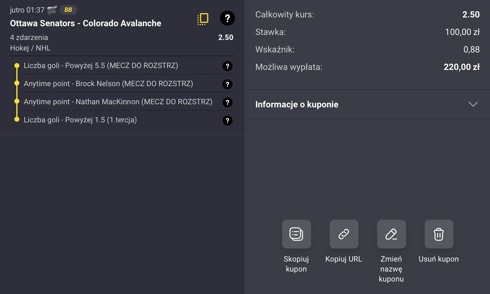 Powyżej 1,5 goli w 1. tercji + Powyżej 5,5 goli w meczu + MacKinnon i Nelson powyżej 0,5 pkt w meczu