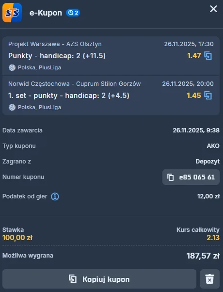 Przed podjęciem ostatecznego typu na to spotkanie, warto zwrócić uwagę też na to, że PGE Projekt w tym sezonie niezbyt radzi sobie w potyczkach, do których przystępuje w roli wyraźnego faworyta. Nawet w poprzedniej kolejce większość kibiców i środowiskowych ekspertów spodziewała się wygranej za 3 punkty. Tymczasem przez chwilę istniało zagrożenie, że to oni nie zdobędą ani oczka. W końcu przegrywali już 1:2 po 3 odsłonach. Dlatego też sądzę, że przy doliczeniu odpowiedniego handicapu, to AZS uzbiera na koniec rywalizacji więcej punktów; co obstawiam z kodem promocyjnym STS-u.
