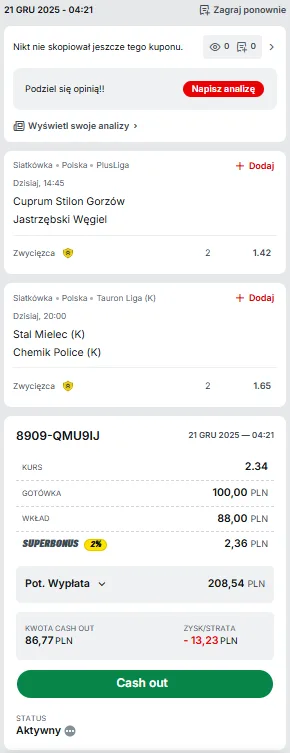 Wówczas w Mielcu policzanki zwyciężały w poszczególnych setach do: 18, 19 i ponownie 18. Zważywszy na aktualną formę ich oraz ich przeciwniczek, trudno spodziewać się tego, by tym razem miało być inaczej. Podsumowując, stawiam z kodem promocyjnym Superbetu na to, że drużyna LOTTO Chemika okaże się lepszą od mieleckiej Stali po raz 6 w 7 starciu ligowym.