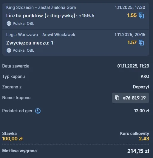 To spotkanie zapowiada się jako mecz wielkich powrotów i emocjonalnych podtekstów. Do Szczecina wracają bowiem trener Arkadiusz Miłoszewski oraz Andrzej Mazurczak, czyli postacie kluczowe w historii Kinga, które od tego sezonu reprezentują barwy Zastalu Zielona Góra. Dodatkowego smaczku dodaje fakt, że obecny szkoleniowiec Kinga, Maciej Majcherek, był wcześniej asystentem Miłoszewskiego w okresie największych sukcesów szczecińskiego klubu. Na ten moment to oczywiście gospodarze wydają się mocniejsi na papierze, jednak Orlen Basket Liga już nieraz udowadniała, że potrafi zaskakiwać. W takich meczach emocje często biorą górę, a tempo gry rośnie z minuty na minutę. Typuję powyżej 159,5 punktu, bo w czterech ostatnich bezpośrednich starciach ten próg zawsze został przekroczony. Wszystko wskazuje na to, że i tym razem możemy być świadkami efektownego, ofensywnego widowiska. Pamiętaj, że czekają na Ciebie tylko i wyłącznie legalni bukmacherzy!