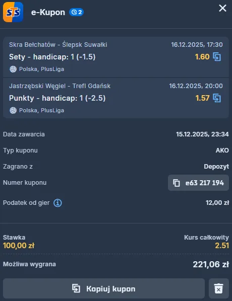 PGE GiEK Skra Bełchatów – Ślepsk Malow Suwałki: typy, kursy bukmacherskie i zapowiedź meczu (16.12.2025 r.)
