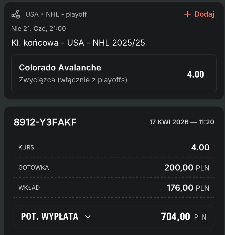 Jeśli miałbym postawić na jedną drużynę w całej NHL jako faworyta do Pucharu Stanleya 2026, Colorado Avalanche byłoby moim pierwszym wyborem. Znakomite sezony regularne przynosiły Avs końcowy triumf w 21 wieku i teraz jestem zdania, że znowu popłyną na tej fali. Pierwsza runda nie powinna być problemem, a kto wie, co się wydarzy w następnych rundach i kto do nich dotrze. Typy NHL, które do tej pory graliśmy, są dostępne w specjalnej zakładce na naszej stronie.