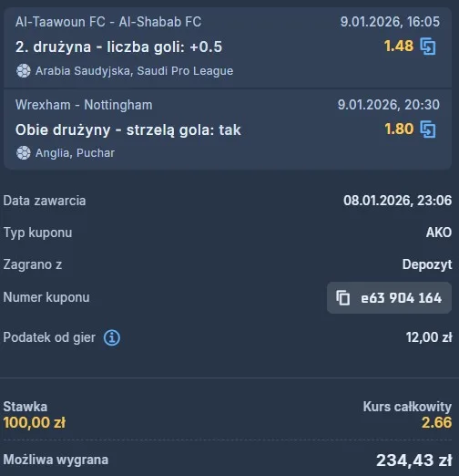 Przed nami ciekawy wieczór z piłką nożną na dwóch zupełnie różnych frontach – w FA Cup ambitny Wrexham A.F.C. podejmie walczący o ligowe przetrwanie Nottingham Forest, a starcie to zapowiada się jako klasyczny pojedynek formy z doświadczeniem. Równolegle w Saudi Pro League rewelacyjny w tym sezonie Al-Taawoun zmierzy się z pogrążonym w kryzysie Al-Shabab, dla którego każdy punkt może być na wagę utrzymania.