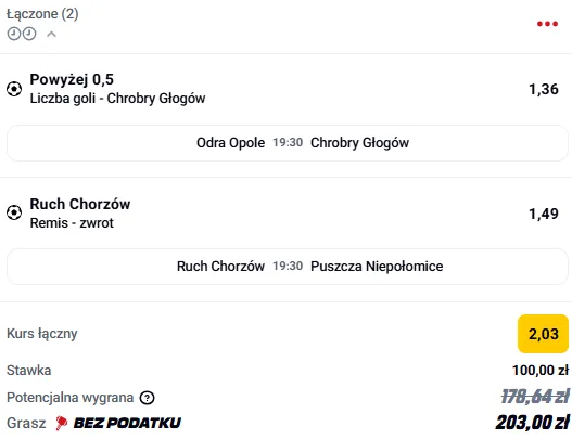 Odra Opole znajduje się wyraźnie w dołku formy – przegrała 3 z ostatnich 4 meczów, a jej gra defensywna pozostawia sporo do życzenia. Z kolei Chrobry Głogów jest mocno rozpędzony, regularnie punktuje i prezentuje jedną z lepszych dyspozycji w lidze. Co ważne, ostatnie trzy bezpośrednie starcia tych drużyn także przemawiają za zespołem z Głogowa: 3:0, 2:0 oraz 1:1. W takiej formie Chrobry powinien znów stworzyć sobie okazje i typuję, że zdobędzie w tym meczu przynajmniej jednego gola. Zachęcam do regularnego obserwowania zakładki typy dnia lub do sprawdzenia innych propozycji na Zagranie!